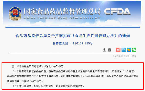 (一)新獲證及換證食品生產者,應當在食品包裝或者標簽上標注新的食品生產許可證編號,不再標注“QS”標志。食品生產者存有的帶有“QS”標志的包裝和標簽,可以繼續(xù)使用完為止。2018年10月1日起,食品生產者生產的食品不得再使用原包裝、標簽和“QS”標志。