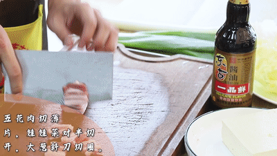 五花肉切薄片,娃娃菜對半切開,大蔥斜刀切圈