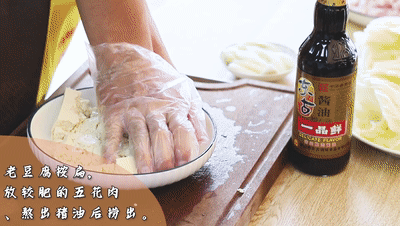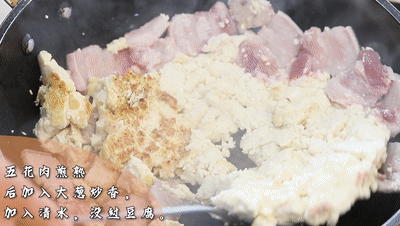 老豆腐放碟子中,用手按扁(隨便怎么按都行)。起鍋放入一半比較肥的五花肉、熬出豬油然后撈出五花肉、加入壓扁的老豆腐和另一半五花肉