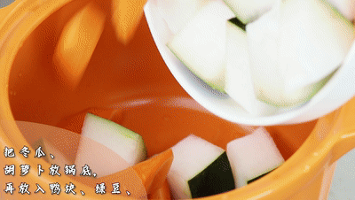 把冬瓜胡蘿卜放鍋底、再放入鴨塊、綠豆、蓮子、薏米、陳皮。