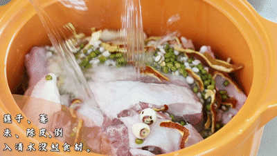 倒入清水沒過食材,大火燒沸轉(zhuǎn)中小火再煲5分鐘