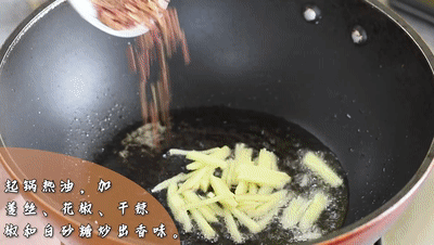 另起鍋熱油,加入姜絲、花椒、干辣椒和一勺白砂糖炒出香味