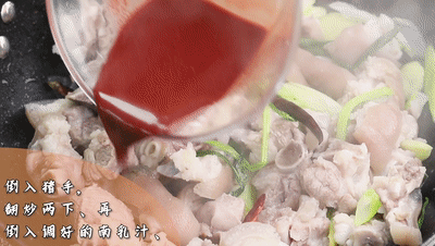 豬手翻炒兩下、再倒入調(diào)好的南乳汁、香葉、桂皮、八角、花椒。