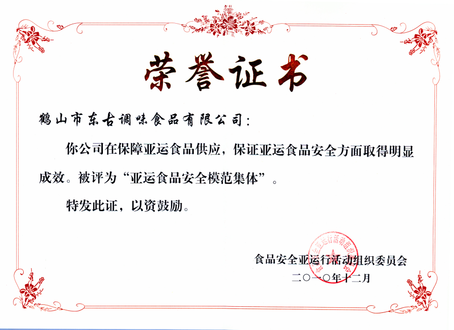 2010亞運食品安全模范集體證書